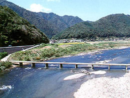 曲線を多様したデザインがユニークな沈下橋です。すぐ下流には支流の中で最も透明度が高いといわれている黒尊川が合流しています。